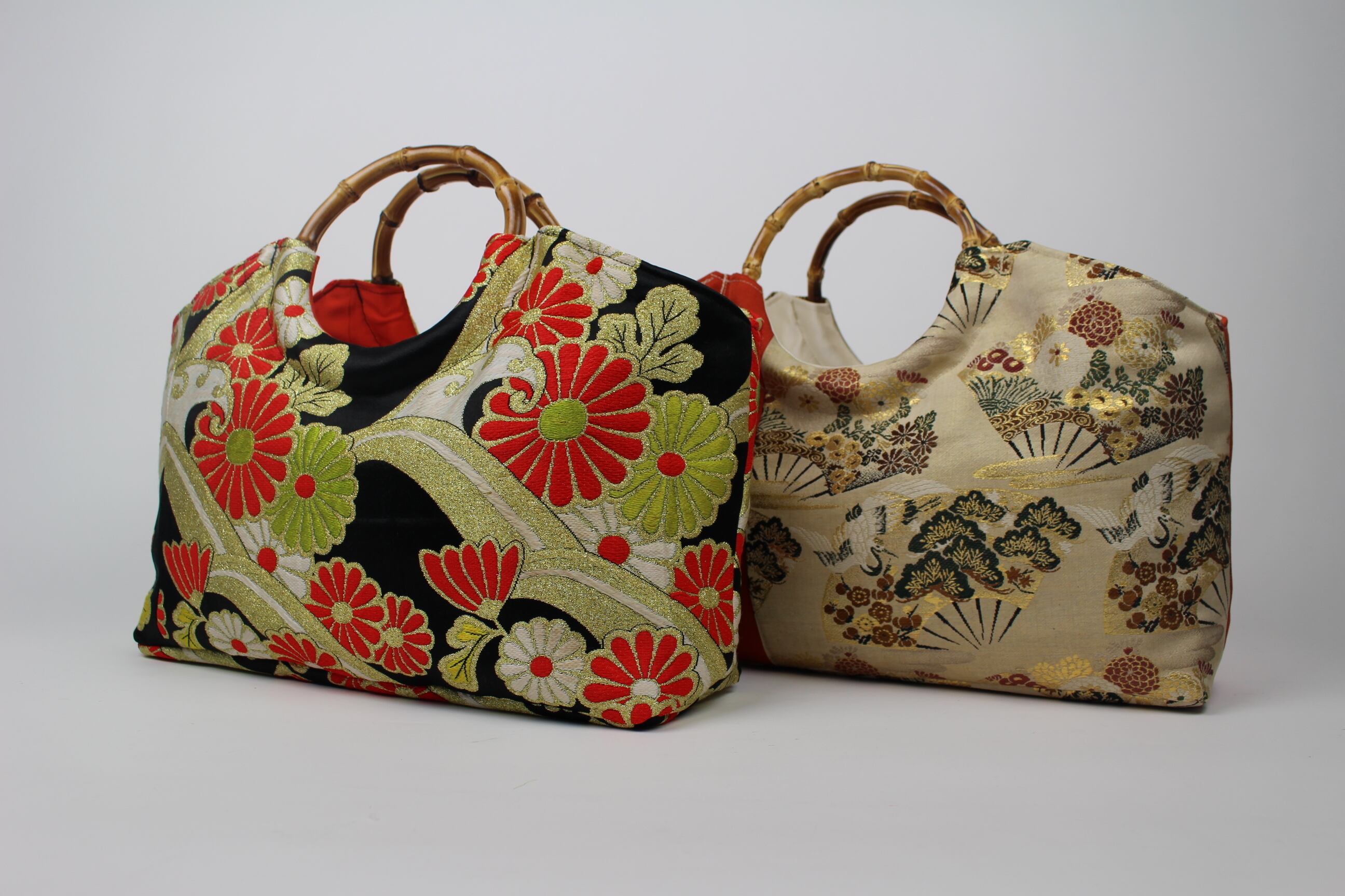 使われなくなった着物や帯から作られた手さげかばんです。